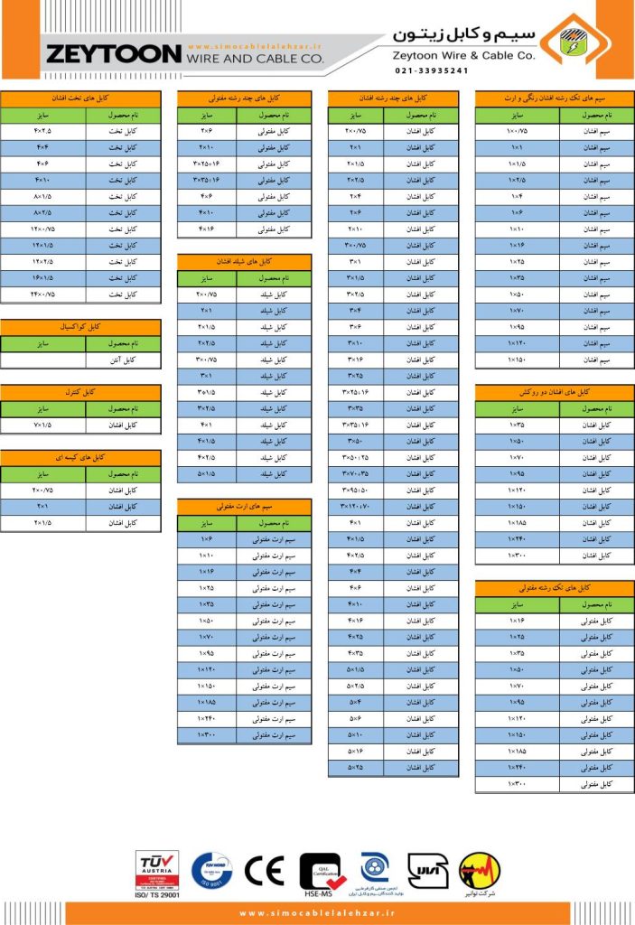 لیست کامل جدول محصولات سیم و کابل زیتون